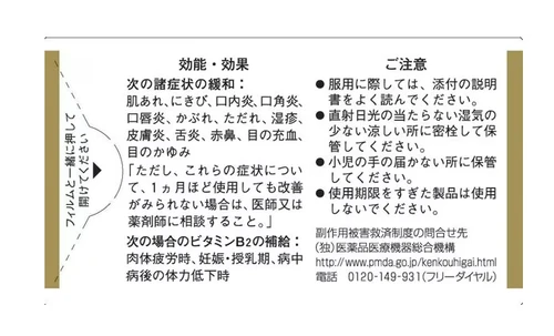 另外,與主要成分維生素B2合作,我們增加維生素B1,B6有效改善皮膚/粘膜疾病如痤瘡,